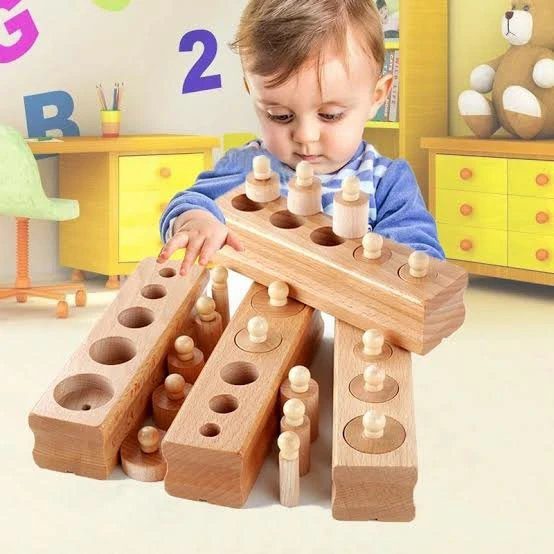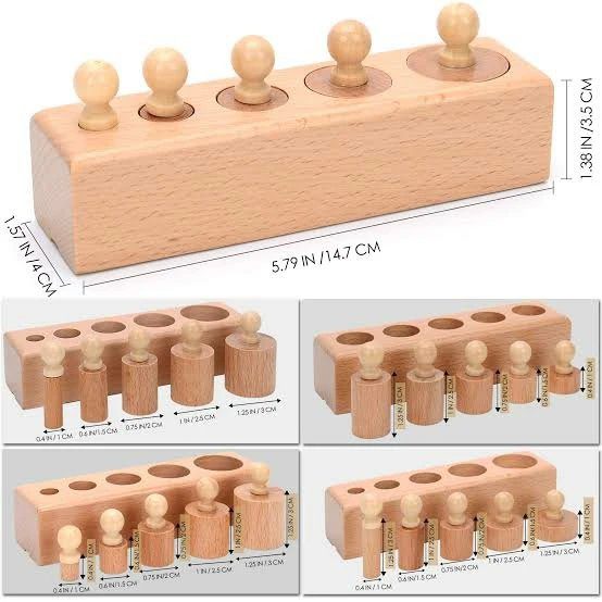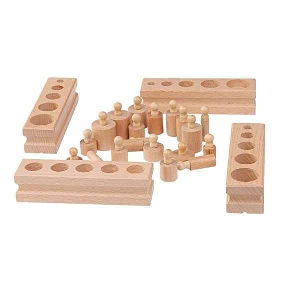 Pick up one knobbed cylinder with right hand and give it to left hand, then feel it with right hand two fingers, feel the rim also,now again give to right hand and put it in the hole.